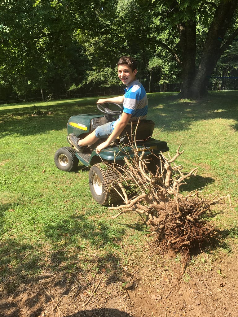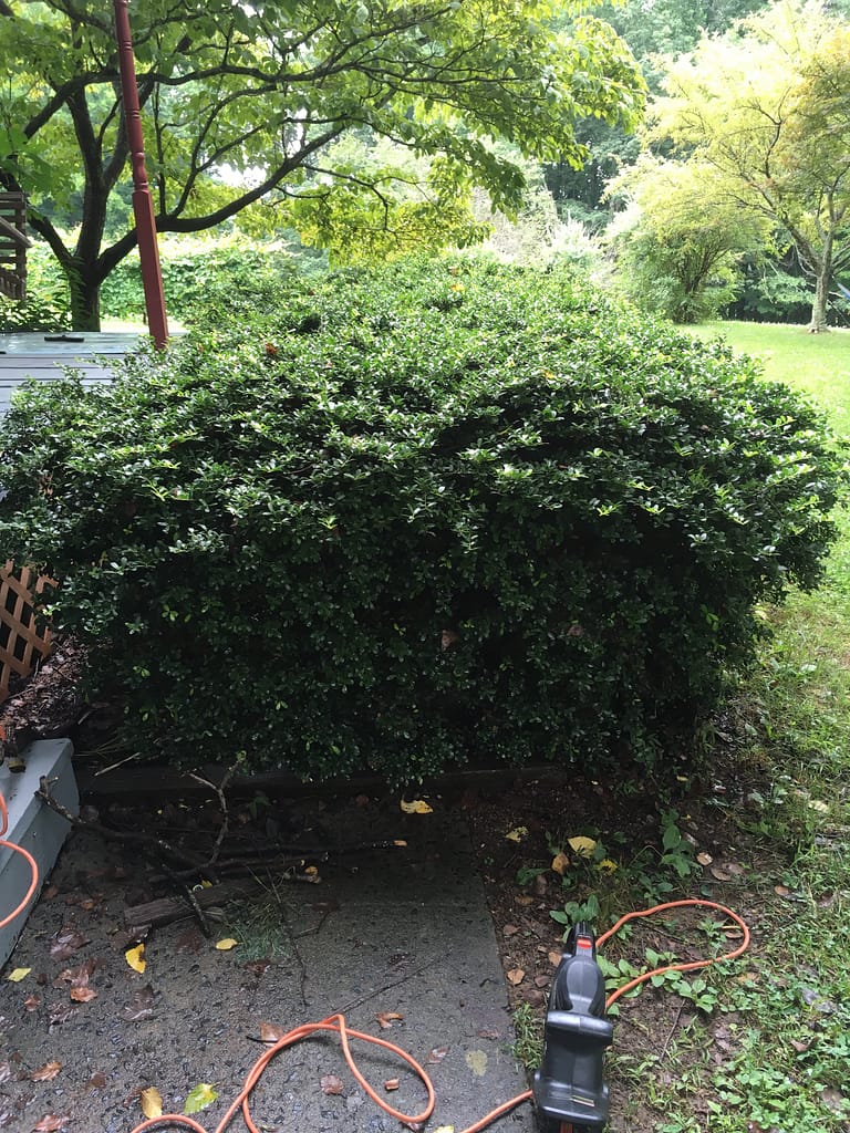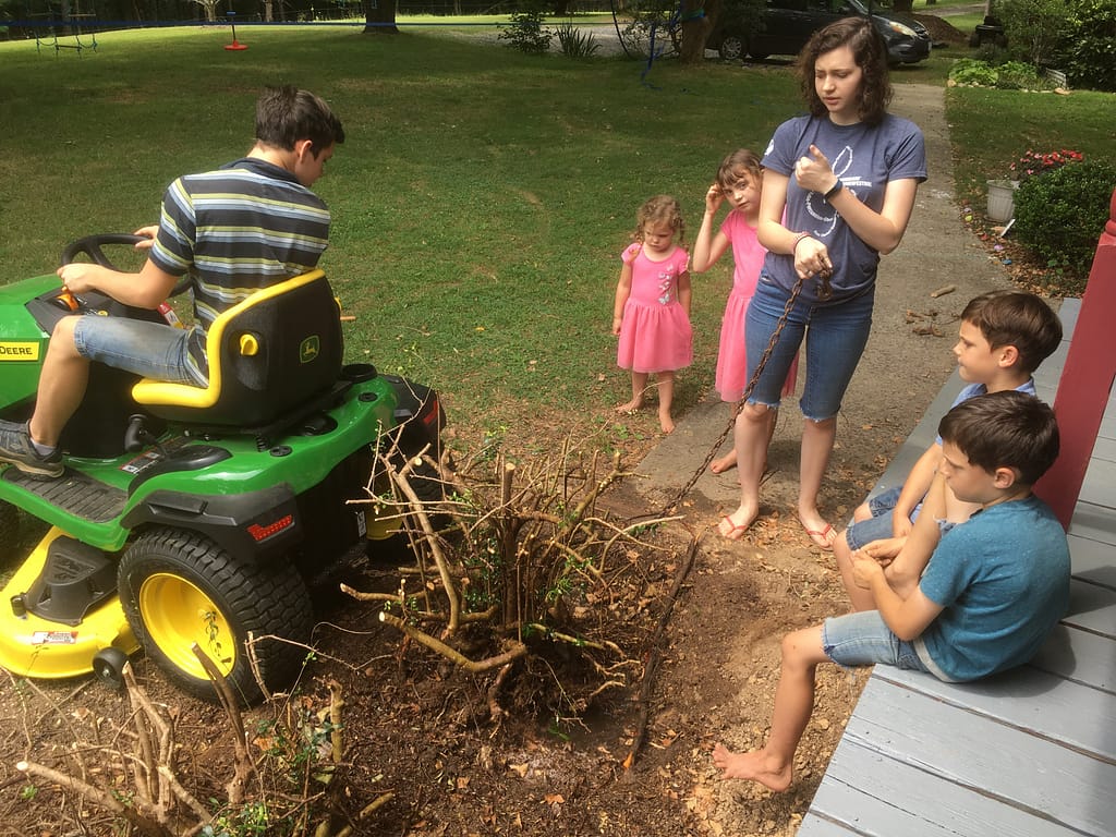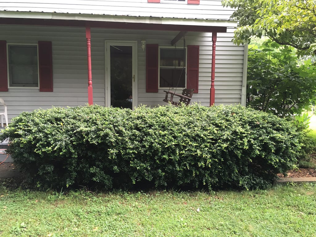 These big bushes made me feel boxed in. I needed space and updated landscaping, so we pulled them out. They were thicker than the sidewalk! Once Andy ran off the porch and cannonballed into them and landed on a wasp’s nest and was stung. We cut each bush down to a stumpy bush, chained it to the lawn mower… And yanked it out.