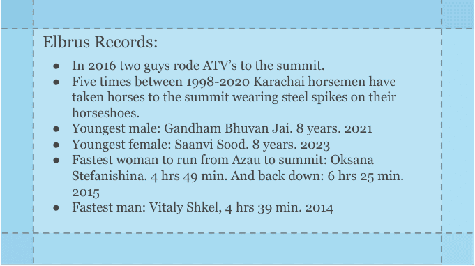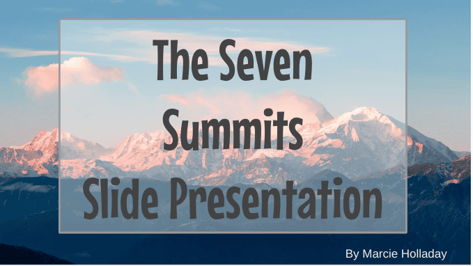 Everything you need to know about the 7 Summits! Each Mountain has about 8 slides that cover: the history of the mountain, how it got its name, fascinating facts about it, oldest & youngest to summit and other records set, how much it costs to climb, how long it takes, best time to go, photos, and so much more!!